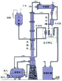 主要用途: 本裝置適用于制藥、食品、輕工、化工等行業(yè)的稀酒精回收。也適用于甲醇等其他溶煤的蒸餾。本裝置根據(jù)用戶的需要,可根據(jù)30℃左右的稀酒精蒸餾至90-95℃酒精,成品酒酒精度數(shù)要求再高,可以加大回流比,但產(chǎn)量相應(yīng)減少。 裝置特點(diǎn): 本裝置采用高效的金屬不銹鋼填料。蒸餾塔采用不銹鋼制,從而防止了鐵屑堵塔填料的現(xiàn)象,延長(zhǎng)了裝置的使用期限。本裝置中凡接觸酒精設(shè)備部分如冷凝器、穩(wěn)壓罐、冷卻蛇管等均采用不銹鋼,以確保成品酒精不被污染。蒸餾釜采用可拆工U型加熱管,在檢修時(shí)可將U型加熱管拉出釜外,便于對(duì)加熱管外壁及蒸餾釜壁進(jìn)行清洗。本裝置可間歇生產(chǎn),也可半連續(xù)、連續(xù)生產(chǎn)。 |