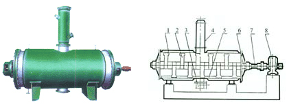 1.殼體 2.耙齒 3.出料裝置 4.加料裝置 5.粉碎棒 6.密封裝置 7.攪拌軸 8.傳動(dòng)裝置 |